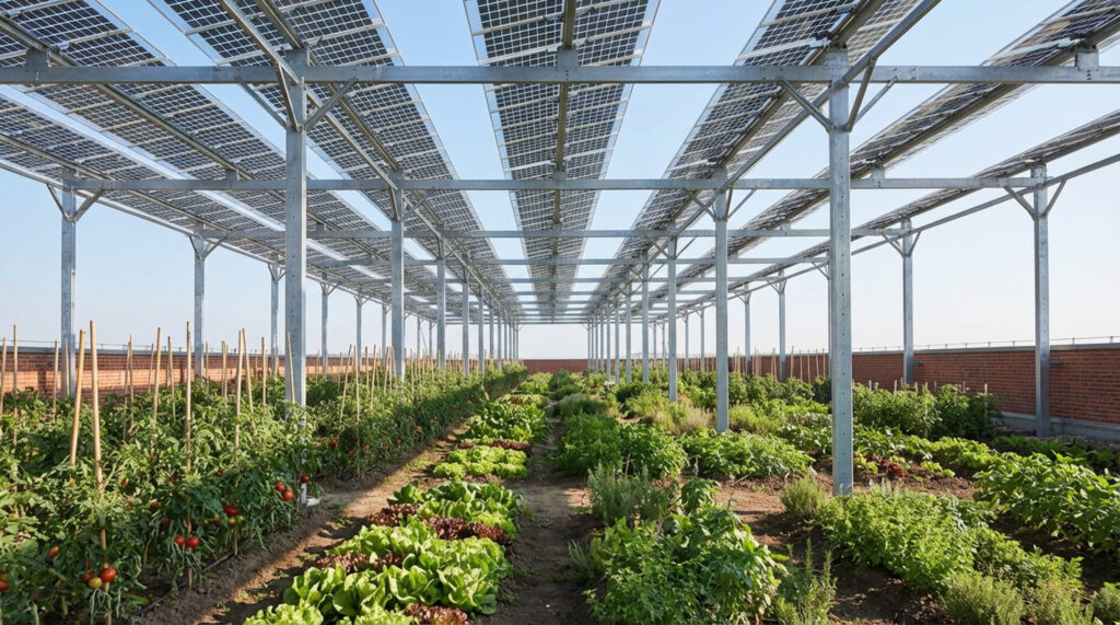 Um möglichst große Flächen für die Nutzung durch Gartenbau und Gewerbemieter zu ermöglichen, wird ein Großteil der Photovoltaik aufgeständert. Das schafft Platz für den erwerbsmäßigen Anbau und bietet zugleich einen Sonnenschutz für Pflanzen und Menschen.